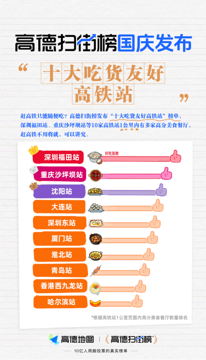 “啥好吃?”“去哪儿吃?”美食体验是旅行途中的重要一环。下车的第一顿食物,往往影响游客对一座城市的第一印象。高德扫街榜此次推出“十大吃货友好高铁站”,就是为了给更多出行游客提供参考。